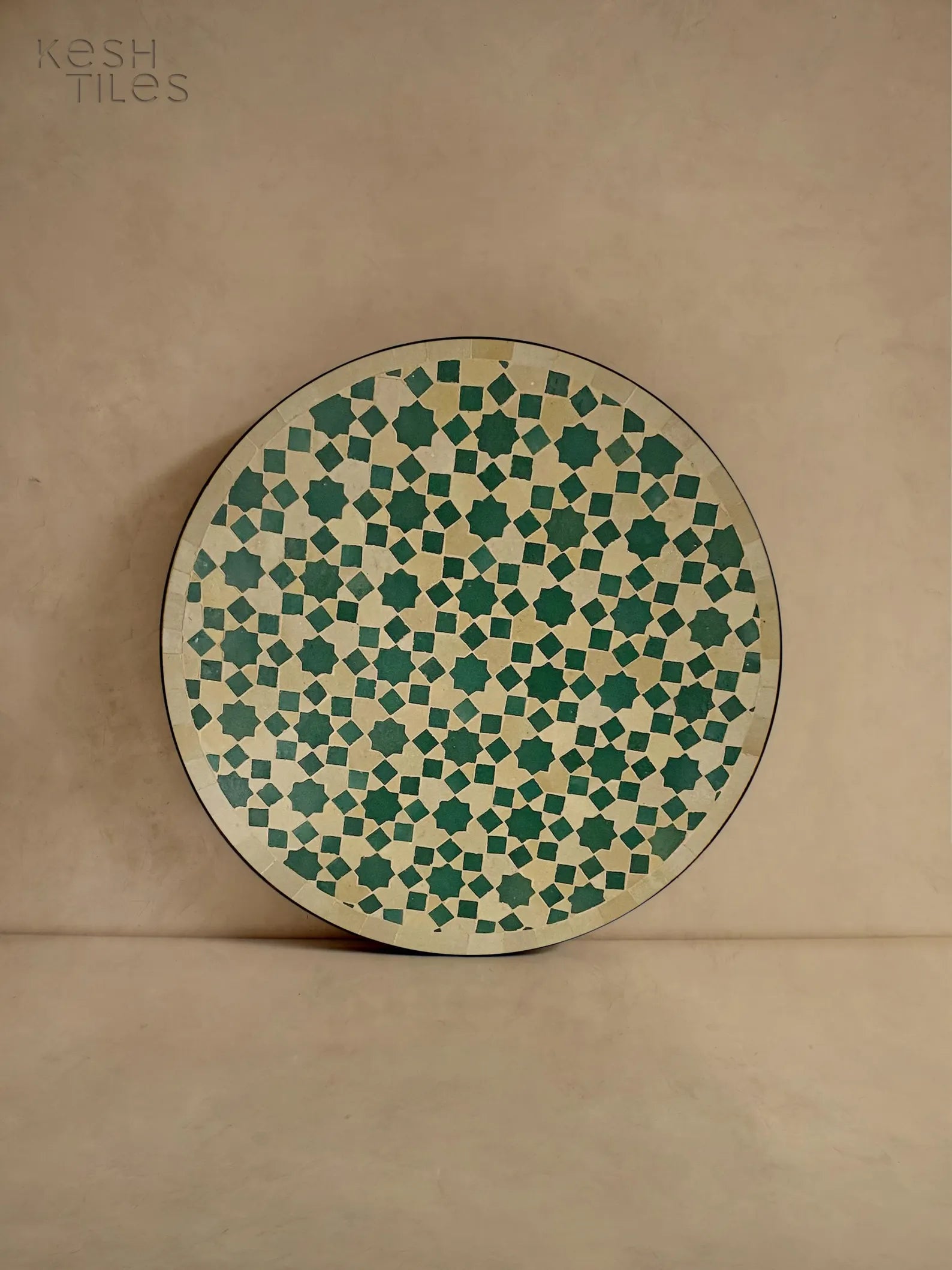 ZELLIJE MOSAIC TABLE, Handmade Round Green Tamegrout And Light Beige Table